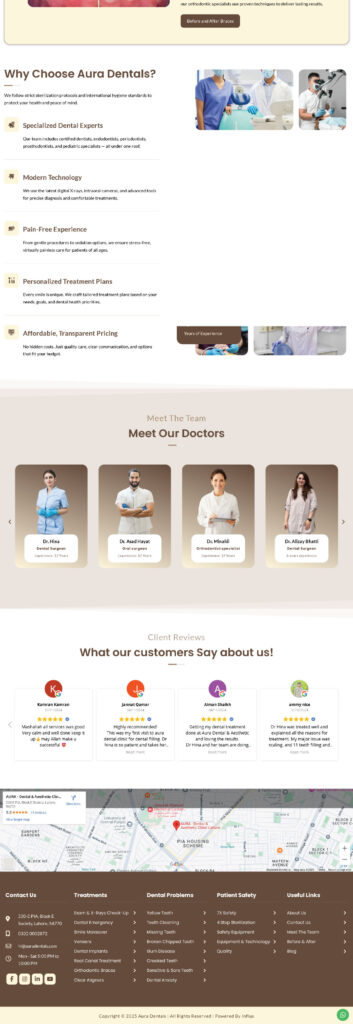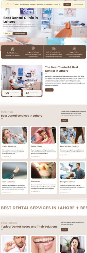 Aura Dentals, a modern dental clinic, wanted a professional online presence that would reflect trust, cleanliness, and care. They needed a website that not only looked aesthetically clean and modern but also made it easy for patients to learn about services and book appointments online.